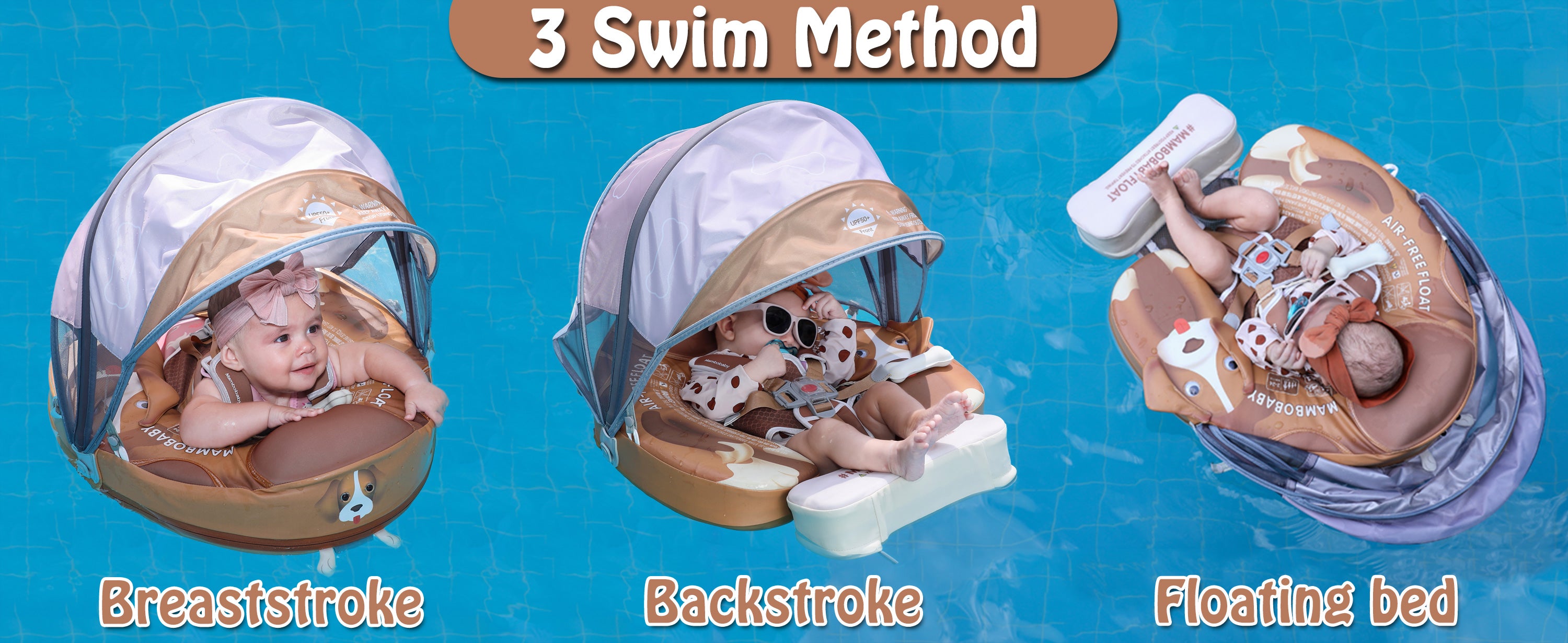 Add removable tail, Prevent baby from flipping backward. Upgraded safety buckle, The Upgraded safety buckle provides 5 support points and perfect 40¡ãangle to keep a balance to avoid baby flip over and fall off. Upgraded into 2 swim ways which are backstroke and breaststroke with different buckle method. Backstroke Suitable for 3~6months baby, breaststroke Suitable for 3~24months baby.